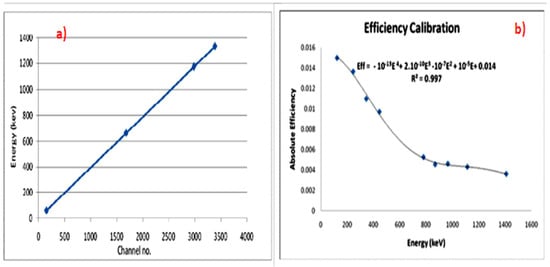 First, the HPGe detector was calibrated (energy and efficiency calibration) using three point sources for the energy calibration—241Am (59.54 keV), 137Cs (661.65 keV), and 60Co (1173 and 1333 keV)—while the 152Eu volumetric source (121.8, 244.7, 344.3, 444, 778.9, 867.4, 964.0, 1112.1, and 1408.0 keV) for the efficiency calibration was as shown in Figure 5. From the efficiency calibration curve, as shown in Figure 5b, the equation for the efficiency as a function of energy was obtained. From this equation, the detector’s efficiency was calculated at 186.2 keV (226Ra) and 1460 keV (40K).