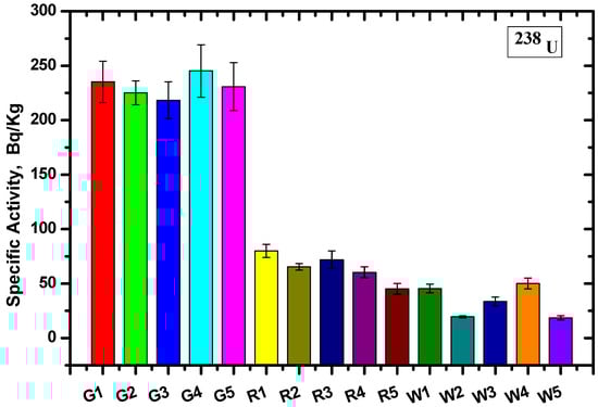 Calculating the count rate and corresponding efficiency of each energy and substituting this into Equation (1), the specific activity of the different radionuclide (AS) samples and the average values were calculated. The values were determined for each site based on the gamma ray spectrometer method for U-238 and K-40 (Figure 6 and Figure 7, respectively).