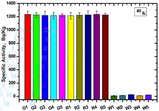 The average worldwide specific activity values of 40K, 238U, and 232Th in soil are 400, 37, and 33 Bq/kg, respectively. Cancer is one of the most detrimental radiation adverse health effects. Hence, the accurate determination of naturally occurring isotopes is essential for determining the radiation health hazard indices to estimate the risk level due to potential exposure to background radiation [,].