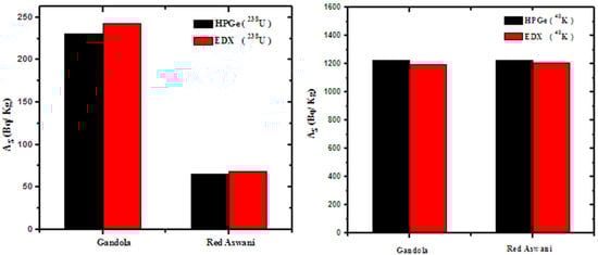 According to Section 2.3, the specific activity was calculated for the same samples and compared with the gamma spectroscopic results, as shown in Figure 8. The relative deviation was calculated between the two results and tabulated in Table 5. The relative deviation between the EDX analysis and gamma ray spectroscopy was determined as:
