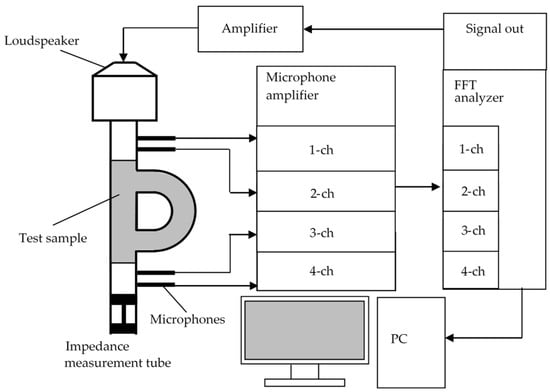 The transmission loss was measured using a Brüel & Kjær Type 4206T 4-microphone impedance-measuring tube (Nærum, Denmark) and an Ono Sokki 4-channel-fast Fourier transform (FFT) analyzer DS-3000 (Yokohama, Japan). A schematic of the measurement apparatus is presented in Figure 1. The silencer is placed in a predetermined position, and two microphones are mounted each in front of and behind the sample. A signal generator and amplifier generate sound waves with a reference signal (linear multisine waves). Furthermore, the microphones detect the sound pressure before and after transmission through the sample. In addition, a 4-channel FFT analyzer measures the cross-spectrum via a signal amplifier for the microphones. The transmission loss was calculated in accordance with the American Society for Testing and Materials (ASTM) E2611-09.