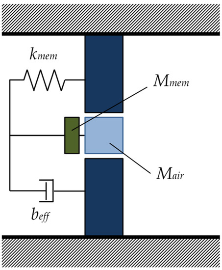 The zero-mass metamaterial comprises a thin film attached to an orifice plate. Figure 4 presents an analytical model of the zero-mass metamaterial. Herein, the calculation is performed as a one-degree-of-freedom vibration system in which the film and the air in the orifice hole vibrate identically. Mmem denotes the mass of the membrane attached to the orifice hole; Mair, the mass of the air in the orifice hole; kmem, the spring constant of the membrane; and beff, the damping coefficient of the zero-mass metamaterial. Here, the spring constant of the thin film kmem was measured using the method of Lee et al. [13].