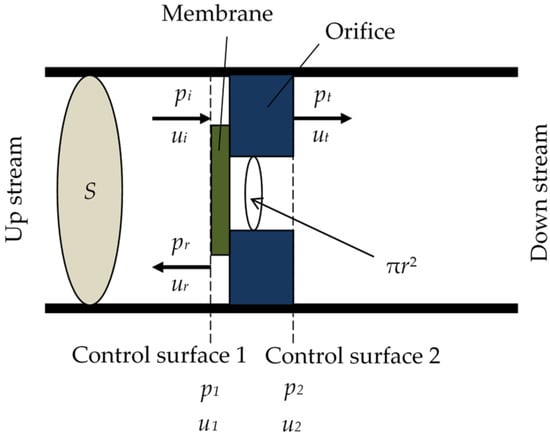 In the theoretical analysis, the transfer matrix method [11,12] was employed for the interference-type silencer ducts. For the zero-mass metamaterial, the acoustic impedance was calculated using the Equation of motion for a spring-mass (damper) system in which the thin film and air in the orifice hole have the same mass and behave similarly. The acoustic impedance was integrated into the transfer matrix of the pipeline system of the silencer. The transmission loss was calculated for the transfer matrix of the silencer and compared with the experimental results to verify the sound reduction characteristics.