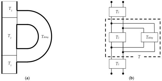 Figure 6 presents the acoustic elements of the delay tube section and equivalent circuit corresponding to the acoustic system. In Figure 6, the tube elements are upstream and downstream of the zero-mass metamaterial and are connected by a cascade connection. The cascade-connected transfer matrix T can be expressed as in Equation (16) using Tm in Equation (15).
