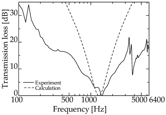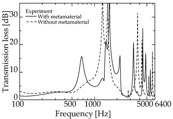 For both experimental values in Figure 11, a sound reduction peak is observed near 1425 Hz. This frequency band is the dip frequency band of the zero-mass metamaterial (Figure 7). The same is true for Figure 12.