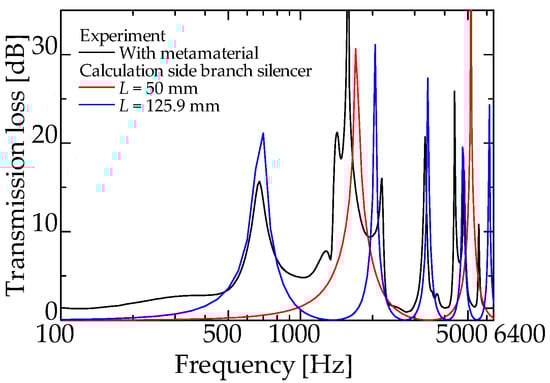 Figure 13 shows the theoretical values for two different conventional side-branch silencers with Ld = 50 and 125.9 mm, respectively, and the experimental values for a zero-mass metamaterial installed at Lda = 50 mm (redrawn from Figure 13).