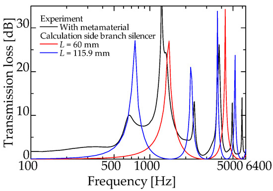 Figure 14 presents the theoretical values for two types of conventional side-branch silencers, with Ld = 60 and 115.9 mm, respectively, and the experimental values for a zero-mass metamaterial installed at Lda = 60 mm (redrawn from Figure 14). Exactly as in Figure 13, the experimental values of the proposed silencer exhibit sound reduction peaks at 735, 1420, and 2200 Hz, in addition to the sound reduction peak near 1425 Hz of the interference silencer. Similarly, the 735 and 2200 Hz sound reduction peaks correspond to the respective peak frequencies of the side-branch silencer with a 115.9 mm branch tube length (blue line in Figure 14). The 1420 Hz peak of the proposed silencer corresponds to the 1420 Hz peak of the side-branch silencer with a 60 mm branch tube length (red line in Figure 14).