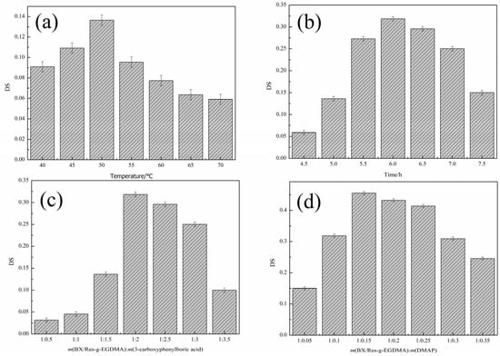 In order to improve the degree of esterification, four variables were considered: esterification temperature, esterification time, the mass ratio of BX/Res-g-EGDMA to 3-carboxyphenylboron and the mass ratio of BX /Res-g-EGDMA to DMAP. As shown in Figure 3, the influence of the above factors was evaluated while keeping the other three factors unchanged. The conclusions were that the optimum reaction temperature was 50 °C and that the optimum reaction time was 6.0 h. As shown in Figure 3c,d, the best mass ratio of BX/Res-g-EGDMA to 3-carboxyphenylboric acid was 1:2, and for m(BX/Res-g-EGDMA):m(DMAP), this was 1:0.15, which was the best feed ratio. Under the best reaction conditions, DS reached 0.485.