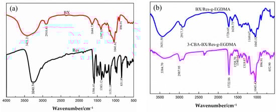 Spectra of BX, Res, BX/Res-g-EGDMA and 3-CBA-BX/Res-g-EGDMA. (a) FTIR spectra of BX and Res. (b) TIR spectra of BX/Res-g-EGDMA and 3-CBA-BX/Res-g-EGDMA.