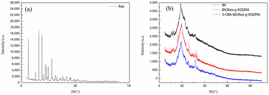 (a) XRD patterns of Res. (b) XRD patterns of BX, BX/Res-g-EGDMA and 3-CBA-BX/Res-g-EGDMA.