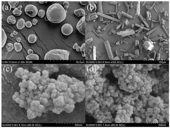 The surface characteristics of the samples were investigated using scanning electron microscopy (SEM). The SEM images in Figure 6 show the morphology of BX, Res, BX/Res-g-EGDMA and 3-CBA-BX/Res-g-EGDMA. As shown in Figure 6a, the morphology of BX was a smooth spherical particle with a mostly unchanged spherical shape and a diameter of about 10–20 μm. Figure 6b shows the morphological characteristics of Res with a smooth, rod-shaped surface and a diameter of about 5–10 μm. As can be seen in Figure 6c, the morphology of BX/Res-g-EGDMA changed to an irregular spherical shape with a non-uniform arrangement of cloud-like particles. As shown in Figure 6d, after the esterification of BX/Res-g-EGDMA with 3-CBA, the cloud-like particles broke up into smaller and more dense particles and most of the aggregate into fish-egg-like structures with an average particle size of about 50–100 nm.