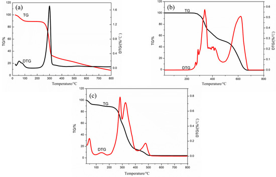 In Figure 7b, the front end of the TG–DTG curve of BX showed a small amount of mass loss (Figure 7b; about 12.16% mass loss). These losses were related to the evaporation of water molecules physically adsorbed on the surface of the sample; the amount of mass loss in the range of 250–325 °C was approximately 60% and was probably due to the breakage of crystalline water and hydroxyl groups on xylan. The loss of bagasse xylan was about 17% in the range of 325–800 °C, probably due to branched-chain residues, the hydroxyl groups on bagasse xylan, the breakage of the main chain of bagasse xylan, etc.
