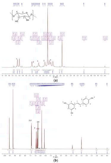 The structures of BX, Res and the synthesized BX/Res-g-EGDMA and 3-CBA-BX/Res-g-EGDMA were characterized using 1H NMR as shown in Figure 8. In all 1H NMR maps, the proton peaks with chemical shift δ = 0 were TMS peaks, and generally, the ones that did not reach δ = 0 were set to δ = 0 by processing during the analysis. As shown in Figure 8a, the chemical shift at δ = 5.11 was the proton at the H1 position on BX; the chemical shifts in the range of δ = 3.3–4.5 were the proton peaks of H2–H5. Figure 8b shows that the double peaks with chemical shifts δ = 6.75 and δ = 6.77 were the proton peaks of H-2 and H-6, the chemical shift δ = 6.92 was the proton peak of H-4, the chemical shifts δ = 7.39 and δ = 7.40 were the proton peaks of H-2′ and H-6′, the chemical shifts δ = 6.80 were the chemical shifts of H-3′ and H-5′, and δ = 6.83 and δ = 6.95 were the proton peaks of Ha and Hb. As can be seen in Figure 8c, the new chemical shifts at δ = 0.85 were the proton peaks of CH3CH2— of EGDMA, and the chemical shift of the proton on —NH2 was δ = 2.63. As seen in Figure 8d, the chemical shifts of —OCOCH3 and —COCH3 appeared at δ = 0.99 and δ = 1.05, while the proton peaks of benzene rings appeared at δ = 7.96 to 8.41. Combined with the IR spectra, it was determined that EGDMA and 3-carboxyphenylboronic acid were successfully introduced into the product.