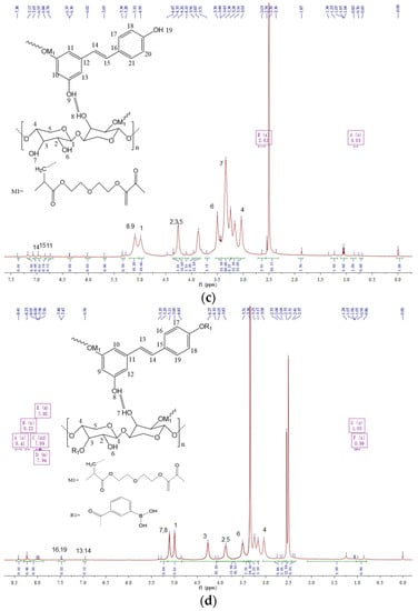 (a) 1H NMR spectrum of BX. (b) 1H NMR spectrum of Res. (c) 1H NMR spectrum of BX/Res-g-EGDMA. (d) 1H NMR spectrum of 3-CBA-BX/Res-g-EGDMA.