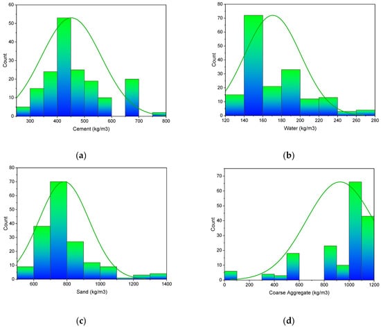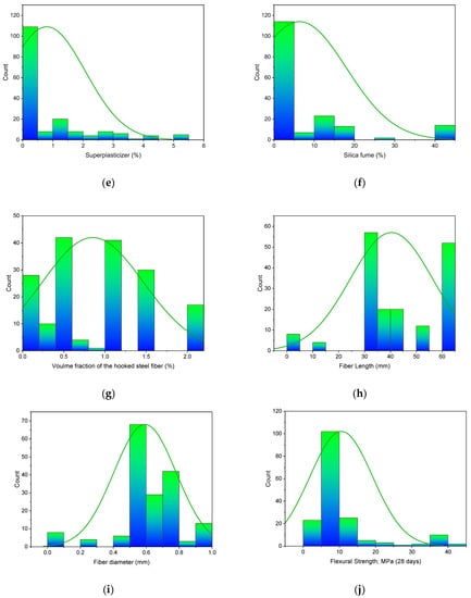 Machine learning techniques require a variety of input parameters to obtain the desired outcome. The data used to calculate the 28 days of SFRC’s flexural strength were gathered from the literature. Cement, water, sand, coarse aggregate content, superplasticizer, silica fume, fly ash, hooked steel fiber volume, fiber length, and fiber diameter were all included as inputs in the model, with just one variable–flexural strength–as an outcome. For the 28-day SFRC flexural strength prediction, this study employed 173 data points (mix proportions). The statistical analysis results of the input variables, such as mean, standard error, median, mode, standard deviation, range, minimum, and maximum values, are shown in Table 1. In addition, Figure 1 shows the relative frequency pattern distribution of all input parameters.