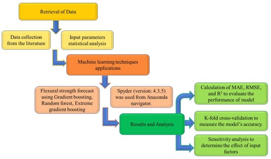 Anaconda software was used to build the machine learning models, employing python code. The Anaconda navigator is a graphical user interface included in the Anaconda software that allows programs to run that give direction via Conda packages, channels, and environments without requiring command-line skills. It also provides Python and R programming languages for data science and machine learning applications, focusing on package creation and maintenance. This work used three ensembled techniques to estimate the flexural strength of SFRC, i.e., Gradient Boosting (GB), Random Forest (RF), and Extreme Gradient Boosting (XGB). The Anaconda navigator’s Spyder (version: 4.3.5) was used for model execution. The R2 value of the projected outcome from all models was used to gauge the degree of accuracy. R2 values typically vary from 0 to 1, with a more significant number implying more accuracy in predicting the measured and projected results. Statistical checks, error evaluation (including MAE, RMSE), and k-fold cross-validation were conducted to examine the models’ performance. A sensitivity analysis was carried out to check the impact of all input factors. Figure 2 illustrates the research strategy.