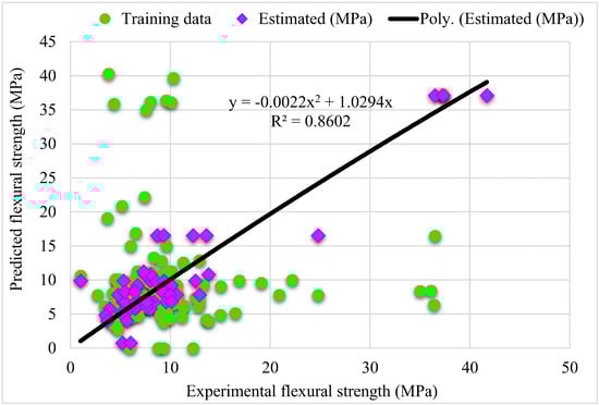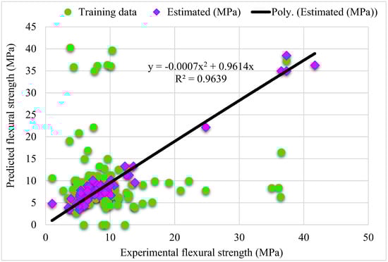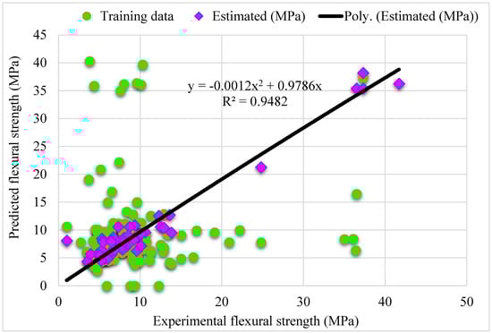 The steel fiber proportion, length, and thickness have a notable impact on the flexural strength of concrete, as reported in the literature. Yazici et al. found that the compressive and flexural strength of concrete improved with increased steel fiber []. Köksal et al. revealed that SFRC compressive and flexural strength improved due to an experimental investigation utilizing fiber volume fractions up to 1% []. A. A. Jhatial et al. determined that the increased content of steel fibers improved the flexural and compressive strength []. H. K. Hussain et al. revealed that steel fibers in concrete remarkably enhanced the strength and durability properties of hardened concrete. The flexural strength significantly increased with the incorporation of hooked end textured steel fibers []. According to Hyun-Oh Shin et al., in terms of flexural behavior of ultra-high-performance fiber-reinforced concrete under uniaxial and biaxial stress states, the straight steel fiber is the most effective []. As a result, ML models must include fiber volume, length, and diameter as variables.