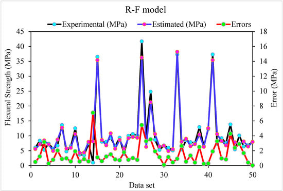 Figure 3 shows a trend of statistical analysis using the R-F model to compare actual and anticipated SFRC flexural strength after 28 days. The R-F produces results within the allowed range and slight variations between predicted and actual outcomes. The R2 = 0.94 indicates that the model is effective at estimating outcomes. Figure 4 depicts the R-F model’s deviations and the distribution of investigational and projected outcomes. The distribution’s highest, lowest, and average error values were 7.09, 0.036, and 1.50 MPa, respectively. It was revealed that 52% of the incorrect readings were less than 1 MPa, 44% were between 1–5 MPa, and 3.8% were higher than 5 MPa. These statistics indicate the degree of agreement between expected and actual results.