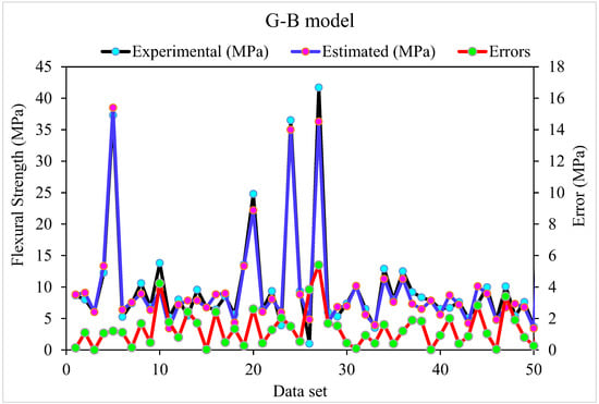 The outputs of the G-B model are depicted in Figure 5 and Figure 6. Figure 5 shows the relationship between actual and expected outcomes, with R2 = 0.96–higher than the R-F model–showing that the G-B approach outperforms the R-F. The distribution of actual and predicted values–as well as errors–in the G-B model is depicted in Figure 6. The distribution’s maximum, minimum, and average error values were 5.4, 0.0026, and 1.34 MPa, respectively. According to the data, 42% of incorrect readings were less than 1 MPa, 56% were between 1 and 5 MPa, and 2% were greater than 5 MPa. Based on the R2 and error distribution of the R-F and G-B models, the G-B model can more accurately predict the SFRC flexural strength.