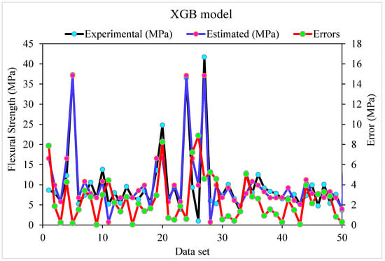 Figure 7 depicts the relationship between actual and predicted outcomes for the XGB model. The R2 value for the XGB model is 0.86, indicating that it is less precise than the R-F and G-B models. Figure 8 also illustrates the XGB model’s actual and anticipated values and errors distribution. The highest, lowest, and mean errors were 8.88, 0.036, and 2.43 MPa, respectively. According to the findings, 30% of the erroneous values were less than 1 MPa, 58% were between 1 MPa and 5 MPa, and 12% were higher than 5 MPa. Due to reduced inaccuracy and more excellent R2 readings, the G-B model was more precise than the R-F and XGB models in this study. Furthermore, ensembled ML approaches such as R-F, G-B, and XGB employed sub-models to obtain the best evaluation, resulting in flawless results. Consequently, ML techniques, i.e., G-B and R-F, were shown to be more accurate than XGB in predicting outcomes in this investigation.