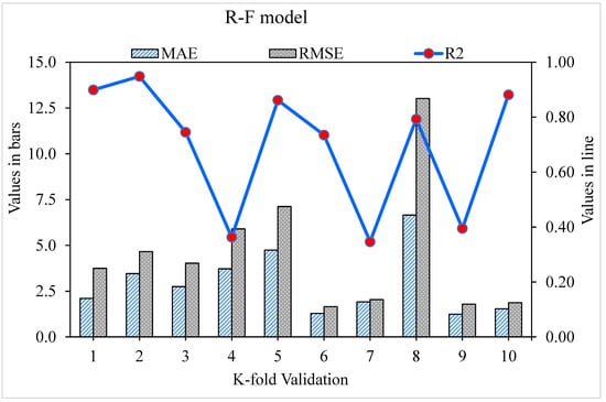The k-fold cross-validation approach is used to verify the model’s validity during execution. This method is frequently used to verify the accuracy of a model in which the data set is spread out and divided into ten groups [,,]. The model was tested with one group, while the other nine were used for training. Overall, 70% of the data set was used in the model training process, with the remaining 30% used to evaluate the models. This process requires randomly dividing the set of observations into k groups or folds of roughly similar size. The first fold is used as a validation set, while the following k-1 folds are used to fit the procedure. The model is deemed more accurate if the R2 value is high and the errors, such as MAE and RMSE, are low. The process needs to be repeated 10 times to provide a satisfactory result. This comprehensive technique is essential for the model’s excellent accuracy. Furthermore, as indicated in Table 2, all models were statistically analyzed as errors (MSE and RMSE). Statistical analysis was used to assess the models’ reaction to estimation, using Equations (1) and (2) from the literature [].