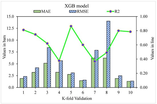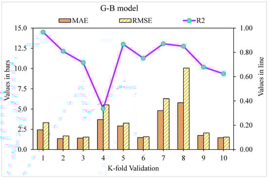 The MAE, RMSE, and R2 distributions for the k-fold cross-validation of Random Forest, Gradient Boosting, and Extreme Gradient Boosting models are shown in Figure 9, Figure 10 and Figure 11. The highest, lowest, and average R2 values for the R-F model are 0.94, 0.34, and 0.69, respectively, as shown in Figure 9. The maximum, minimum, and average R2 values for the G-B model are 0.96, 0.33, and 0.74, respectively, as shown in Figure 10. Figure 11 shows the highest, lowest, and average R2 values for the XGB, which were 0.86, 0.36, and 0.64, respectively. The average MAE and RMSE for the R-F model were 2.94 and 4.58, respectively, when the error values were compared. The average MAE and RMSE for the G-B model were 2.7 and 3.68, respectively, whereas the average MAE and RMSE for the XGB model were 3.32 and 5.10, respectively. The G-B model with the lowest error and highest R2 value performs the best in forecasting outcomes. Table 3 provides the results of the k-fold study for the models used, including MAE, RMSE, and R2 values.