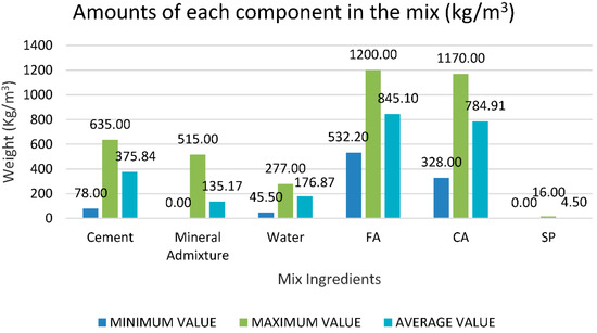 Table 2 illustrates the lowest, highest, and mean of specific variables as inputs (cement, supplementary cementitious materials, fine aggregate, water, coarse aggregates, and superplasticizers) and one potential output (compressive strength of recycled aggregate self-compacting concrete) based on these published research publications. Figure 1 and Figure 2 illustrate their graphical representation.