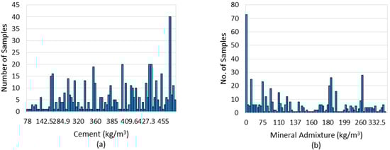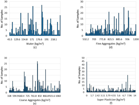 Frequency analysis (histogram) of input parameters: (a) Cement; (b) Mineral Admixture; (c) Water; (d) Fine Aggregates; (e) Coarse Aggregates; (f) Superplasticizer.