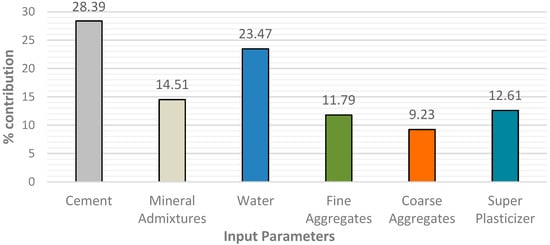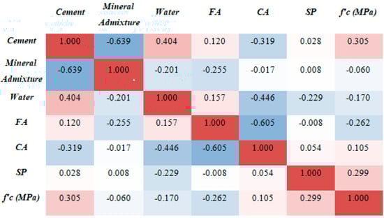 This statistical analysis helps in the development of the predictive model by improving the accuracy of the outcome prediction. The relationship between the variables of input (fine aggregates, water, cement, admixtures, superplasticizers, and coarse aggregates) and the variable of output (compression strength) was investigated to see if there was a link [100]. The Pearson correlation matrix (heat map) is created to analyze the correlation between the independent input variables, as illustrated in Figure 4. The model’s predictions might be skewed if input variables have correlations (|R| > 0.8) that suggest multicollinearity between variables. Although several characteristics are significantly correlated, for example, cement and mineral admixtures have a correlation of −0.639, whereas CA and FA have a correlation of −0.605. However, none of the features showed a correlation (|R|) greater than 0.80, demonstrating the lack of multicollinearity [101,102].