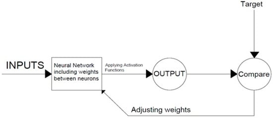 As an outcome, a trained neural network may produce the intended output by receiving the inputs and considered the updated weights, as shown in Figure 5. The system becomes stronger by computing the error and comparing the required input and output. ANN includes three steps: training, validation, and testing. The model is run repeatedly throughout the training phase until the desired outcome is obtained. Errors from the validation stage are discovered during training [104]. The fact that the machine learning model improves with time implies that the prediction model’s accuracy may be increased and that the projected outcomes are dependable. Nonlinear activation functions such as sigmoid (tansig and logsig) are commonly utilized due to their exceptional responsiveness [105].