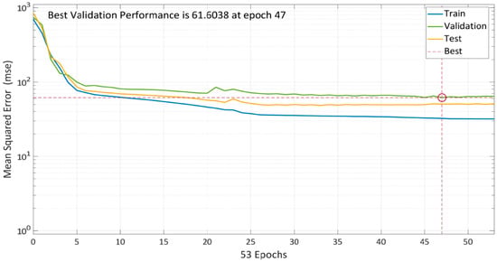 To find the best model, the algorithm is continuously trained. The model’s performance with 10 total neurons is shown in Figure 8. Multiple colored lines make up the plot, which stand for training, validation, and testing. To prevent data overfitting, the model starts with a high MSE and subsequently decreases it based on validation criteria. After 47 epochs, the training error started to decrease, but validation and testing errors were increasing. As a result, the model training process concluded after five further epochs, and at the 47th iteration, an optimized model with the lowest MSE of 61.6038 was created.