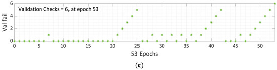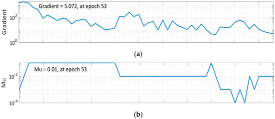 Epoch 47 is found out to be most suitable option for LM algorithm network training because, while the mistakes in training data decline over time, the errors in validation and test data rise. In the Levenberg–Marquardt method, Mu is the learning rate, and 0.01 was chosen after specific iterations (Figure 9b). The training process has been halted after six validation failures.