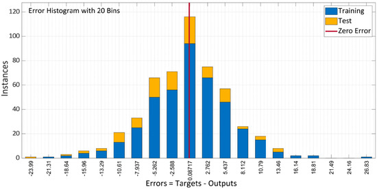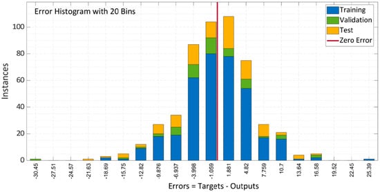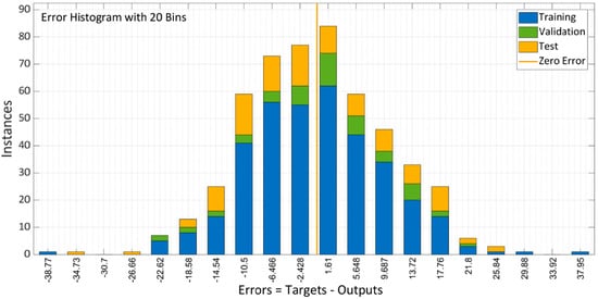 Figure 14 depicts the model error histogram between training and testing. The plot illustrates that in comparison to the LM approach, the bar’s approach to the zero-error line is rather exceptional and the error is very low. The model does a decent job of forecasting the results of the compressive characteristics of SCC with RA, according to the results of this performance criteria.