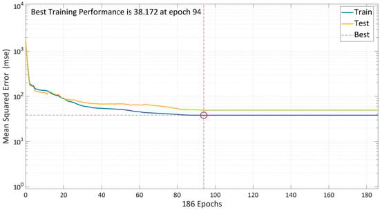 Similarly, the Bayesian regularization approach is used to train the model. The model’s performance with the same number of neurons is depicted in Figure 12. The plot comprises of two-colored lines that only indicate training and testing because this algorithm already has an in-built kind of validation during the training stage. To avoid overfitting the data, the model starts with a high MSE and gradually lowers its reliance on the training parameters. The graph demonstrates that the model required several epochs since BR takes slightly longer time. After 94 epochs, the training and testing error lines had significantly decreased, and they were almost straight. The model is further trained to ensure comprehensive validation, and training is halted after 190 epochs. The model evaluated that the best training performance by the BR algorithm is at the 94th iteration, i.e., a minimum MSE of 38.172.