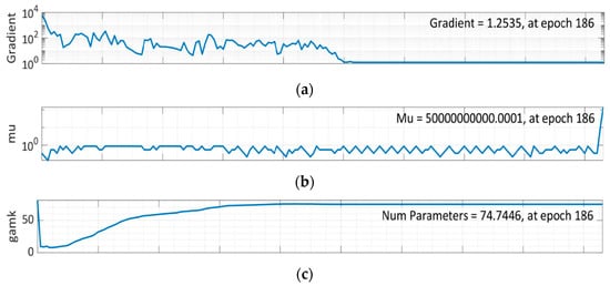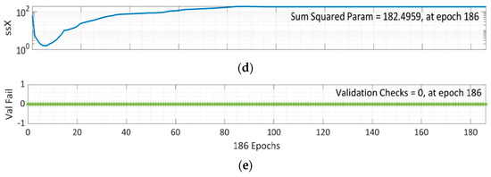 It can be seen from Figure 13a that training data errors decrease over time. Still, validation and test data errors rise. Therefore, the model is trained further at 186 epochs for comprehensive validation, and epoch 94 is found out to be the most suitable option for this network training, as shown in Figure 12. As Mu is the controlling parameter to train in the BR algorithm, 5 × 1010 was chosen after several rounds, as seen in Figure 13b. Effective parameters used by this algorithm were approximately 74 at epoch 186. Figure 13e further shows that no validation checks are carried out, since BR already has an in-built type of validation during the training stage, negating the need for a validation step.