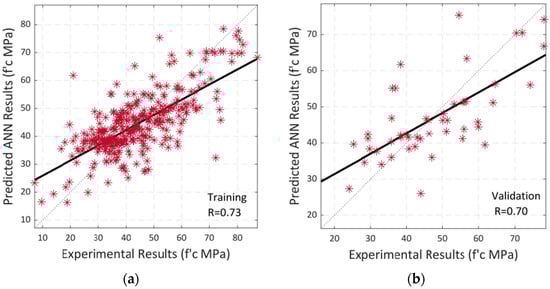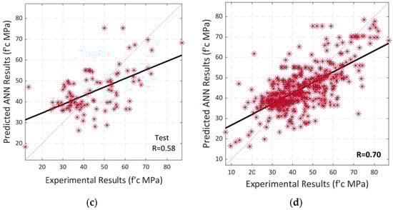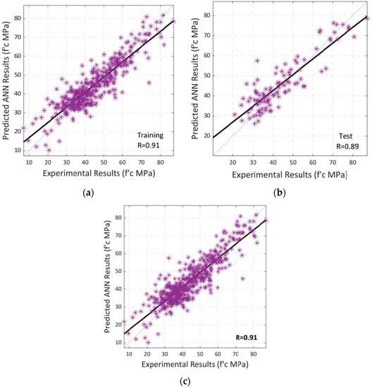Following that, a regression analysis was carried out in the same way. The training and testing correlations between the model’s input and output variables are shown in Figure 15a–c, which depict the overall correlation. A black-colored linear fit is presented in each scenario. The total R-value of 0.91 indicates that the model trained using Bayesian regularization has a high level of accuracy in predicting the output, i.e., the compressive strength of SCC using RA.