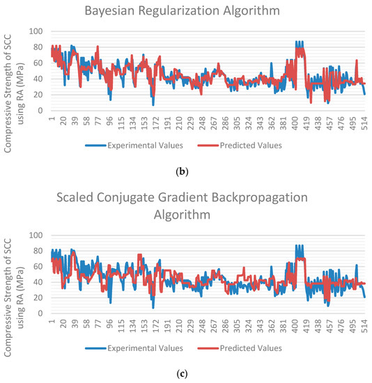 The primary purpose of this study is to use artificial neural networks to validate and forecast the compression strength of CC utilizing RA. Different techniques, such as Levenberg–Marquardt (LM), Bayesian regularization (BR), and Scaled Conjugate Gradient Backpropagation (SCGB), are developed and compared for this purpose.