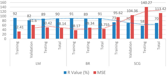 Mean squared error (MSE) and coefficient of correlation (R-Value) were used to assess the models’ performance [109,110], as shown in Equations (1) and (2), respectively.