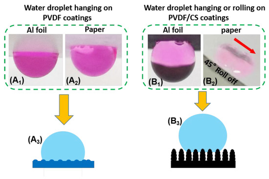 Besides the hydrophobicity, the “stickiness” of the coatings is also significant from the application point of view. Figure 2A1,A2 shows that pure PVDF coatings (either on the Al foil or paper substrate) are very sticky, as evidenced by the observation of semi-spherical water droplets on the coatings at a tilt of 180°. This highly sticky hydrophobic coating was reported to be the result of the pseudo-hydrogen bonding effect of the polarized C-H bonds in each repeating unit of PVDF polymer chains [29]. Unlike pure PVDF coatings, PVDF/CS composite coatings show different stickiness behaviors for the substrate. The composite coatings on paper allow the water droplet to roll off at a tilt of 45° (Figure 2B2), whereas the coatings on the Al foil still show water-stickiness (Figure 2B1) although not so strong as the pure PVDF coatings in Figure 2A1,A2. Thus, the loading of CS into PVDF solution during the electrospraying process not only enhances the coating hydrophobicity, but also reduces the “stickiness” of the coatings, which is useful for potential applications in the field of self-cleaning and anti-corrosion.