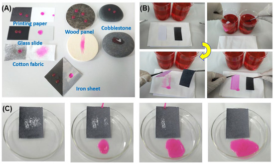 In the electrospraying process, the solution is highly charged and undergoes Coulomb fission and breaks into tiny self-dispersing droplets [21]. As the solvent evaporates, deposits (coatings) of different morphologies and roughnesses are produced on the target substrate depending on the solution parameters (solution composition, solvent evaporation rate, etc.) and the processing parameters (applied voltage, solution feed rate, and the needle tip-to-collector distance, etc.). Thus, the coatings electrosprayed using (cocktail) solution with low surface energy are hydrophobic or superhydrophobic, as shown in Figure 1. This simple process also allows for superhydrophobic deposits on any solid substrates of various geometrical configurations [31,32]. The representative substrates (including glass slide, cotton fabric, printing paper, iron sheet, wood panel, and cobblestone) with PVDF/CS coatings show excellent water repellency as compared with the untreated substrates (Figure 3A). Moreover, a double-faced superhydrophobic printing paper was fabricated via electrospraying with PVDF/CS composites on both sides of the paper. As shown in Figure 3B, the coated paper is perfectly clean as it is taken out from the red water, whereas the uncoated paper is completely wetted by the water and leaves the stains on the cotton.