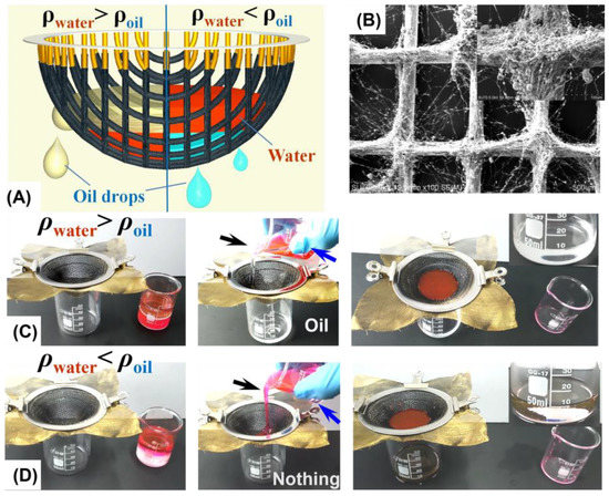 As was previously pointed out by most publications [28,34,35], the use of superhydrophobic and superoleophilic (or superhydrophilic and underwater superoleophobic) mesh in oil/water separation normally encountered the problem of a water (or oil) barrier that blocks oil (or water) from passing through the membrane. To avoid this problem, we propose a “Taylor cone”-like 3D mesh container that allows both oil and water to touch the container wall, such that the separation of both light (ρoil < ρwater) and heavy (ρoil > ρwater) oil/water mixtures can be achieved. As illustrated in Figure 5A, when light oil/water mixtures are loaded into the superhydrophobic and superoleophilic mesh container, the oil (green) can pass the mesh even though water (red) settles down to form the barrier. For the separation of heavy oil/water mixtures, the oil (light blue) can directly pass through the bottom, whereas water (red) is blocked in the container. To validate the proposed model, a superhydrophobic and superoleophilic copper mesh (120) was electrosprayed with PVDF/CS composites, the SEM image of which is shown in Figure 5B. The as-prepared mesh was then sandwiched between two identical structural stainless steel meshes (200) to form the “Taylor cone” container. Light oil/water separation was performed by pouring a mixture of 10 mL hexadecane and 10 mL water into the container, and the separation was successfully finished after a few seconds (Figure 5C). A similar process was successfully conducted for heavy oil/water separation, where chloroform was used as the heavy oil (Figure 5D). By properly pumping out the water accumulated in the container, continuous oil/water separation can be realized for oils of any density [28].