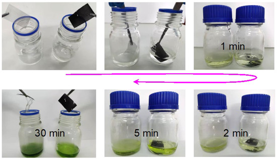 The anti-corrosion experiment was conducted by immersing the uncoated stainless steel mesh and the double-faced superhydrophobic mesh (coated with PVDF/CS coatings) into the concentrated HCl solution. As shown in Figure 6, the uncoated mesh reacts with the solution more rapidly than the coated mesh, as revealed by darkening of the solution color. After 30 min, both of the meshes were carefully picked up for comparison. The double-faced mesh was nearly intact, whereas the uncoated mesh was badly destroyed, indicating the potential of using the coatings to protect the metal from corrosion. The agglomeration and chemical inertness of CS particles provide PVDF/CS coatings with a rough surface topography and chemical inhomogeneity, allowing the coatings to be in the Cassie–Baxter state to slow down solution erosion [11,36].