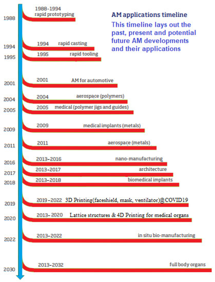 The timeline for the developments on additive manufacturing (AM), showing the past, present, and potential future (Adapted from original image with permission. Courtesy: Graham Tromans of Graham Tromans Associates, London, UK & Terry Wohlers of Wohlers Associates, Youngstown, OH, USA).