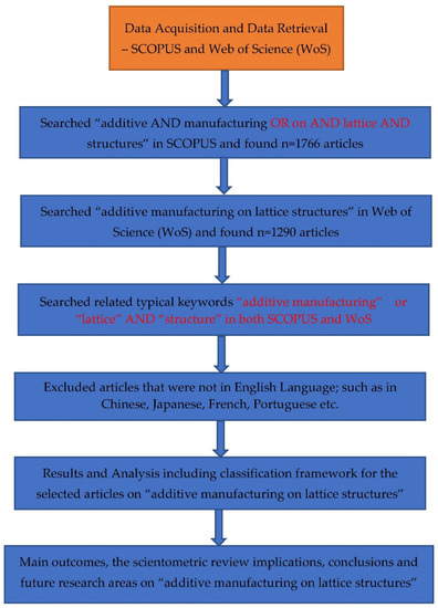 In this study, a scientometric analysis is carried out using research database and visualization-mapping tools to investigate research trends and patterns on the subject area. By inflection, scientometrics is used to reveal the research impact of publications, researchers, journals, and research institutions in a particular field of study. By definition, scientometrics also includes the quantitative study of science, science policy, and science communication, which gives an in-depth understanding of the research through the scientific citation and offers a deeper understanding of scientific citations [87,88,89]. To gain a thorough understanding of the evolution of this research field from 2002 to 2022, this study will conduct a scientometric evaluation and analysis of the papers pertaining to the multi-material additive manufacturing of engineered lattice structures. The scientometric review is also qualitatively validated by comparing the present data with other bibliometric studies on AM [38,39,40,90,91,92,93]. An extensive systematic review is then offered to offer deeper insights into the technology and applications of multi-material additive manufacturing of polymers based on the findings of the scientometrics analysis. In a nutshell, this study used a mixed review methodology, which combines scientometric analysis and systematic review, to examine the state of research on additive manufacturing for lattice-structure materials. By combining subjective research with a robust quantitative description and evaluation using science network mapping techniques, this study’s contribution can be seen as extending past review works in this field. The flowchart of the methodology is presented in Figure 2.