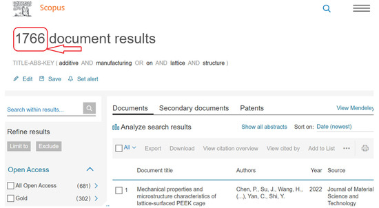Scopus database supplied by Lancaster University UK, showing keyword “additive manufacturing on lattice structures” for meta-analysis (on 20 June 2022).