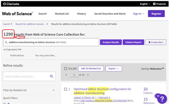 Web of Science (WoS) database supplied by Lancaster University UK, showing keyword “additive manufacturing on lattice structures” for meta-analysis (on 20 June 2022).
