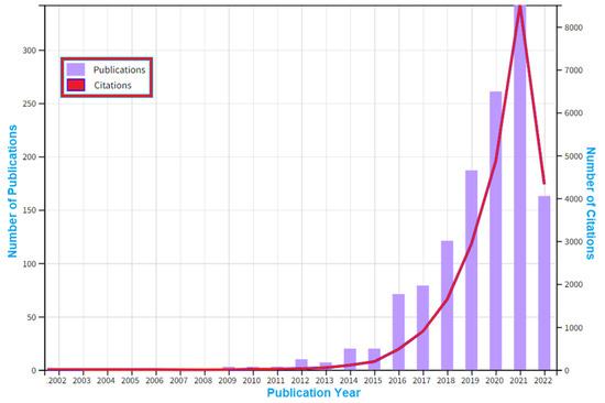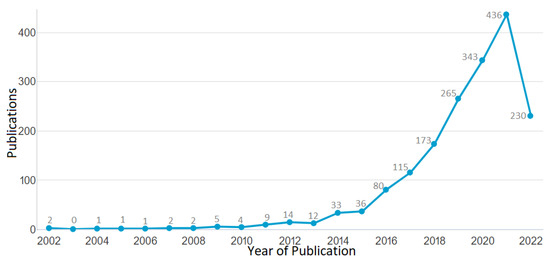 The number of publications against years of publication for publications from 2002 to 2022 (data retrieved from the Scopus database on 20 June 2022).