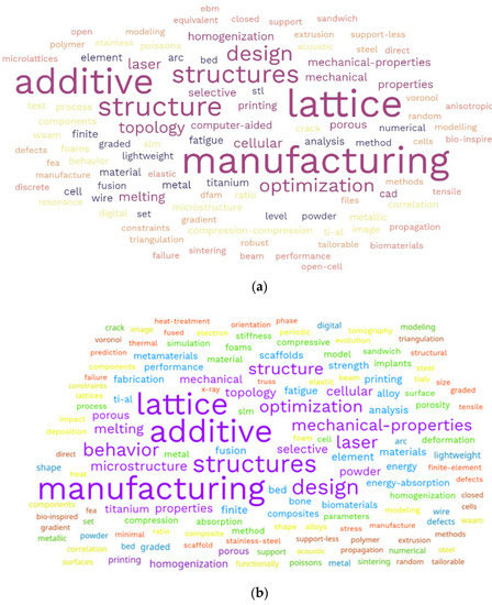Word cloud on keywords published articles on “additive manufacturing on lattice structure” research (data retrieved from WoS database on 20 June 2022), showing (a) scheme 1 and (b) scheme 2.