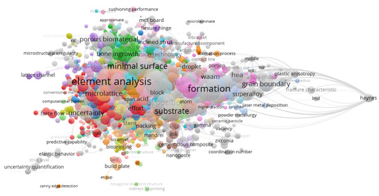 Visualization of a network for keywords published in articles on “additive manufacturing on lattice structure” research (data retrieved from the WoS database on 20 June 2022 and visualized with VOSviewer).