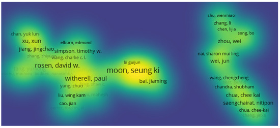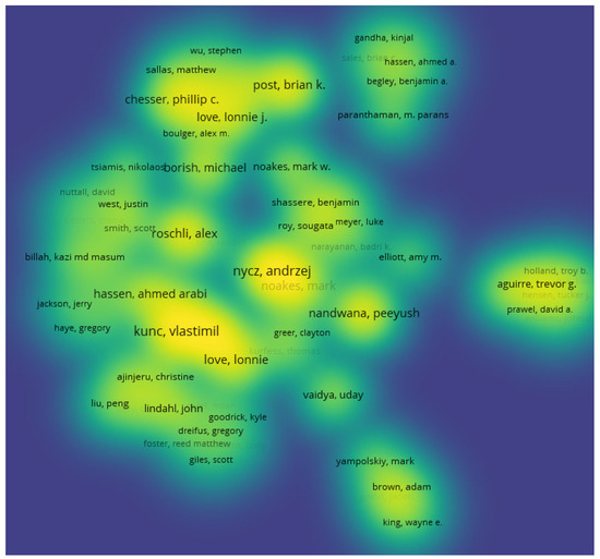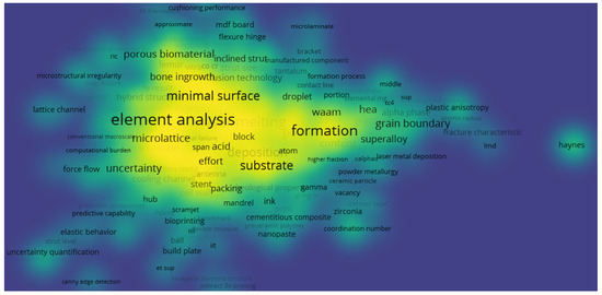 Bibliometric map showing a visualization of the density for keywords published in articles on “additive manufacturing on lattice structure” research (data retrieved from the WoS database on 20 June 2022 and visualized via VOSviewer).